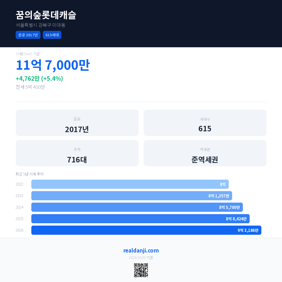 꿈의숲롯데캐슬 국민평형 기준 2026년 평균 거래가는 9억 3,186만으로, 전년 대비 5.4% 상승 했습니다.