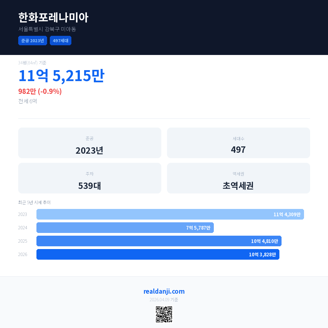 한화포레나미아 국민평형 기준 2026년 평균 거래가는 10억 3,828만으로, 전년 대비 0.9% 하락 했습니다.