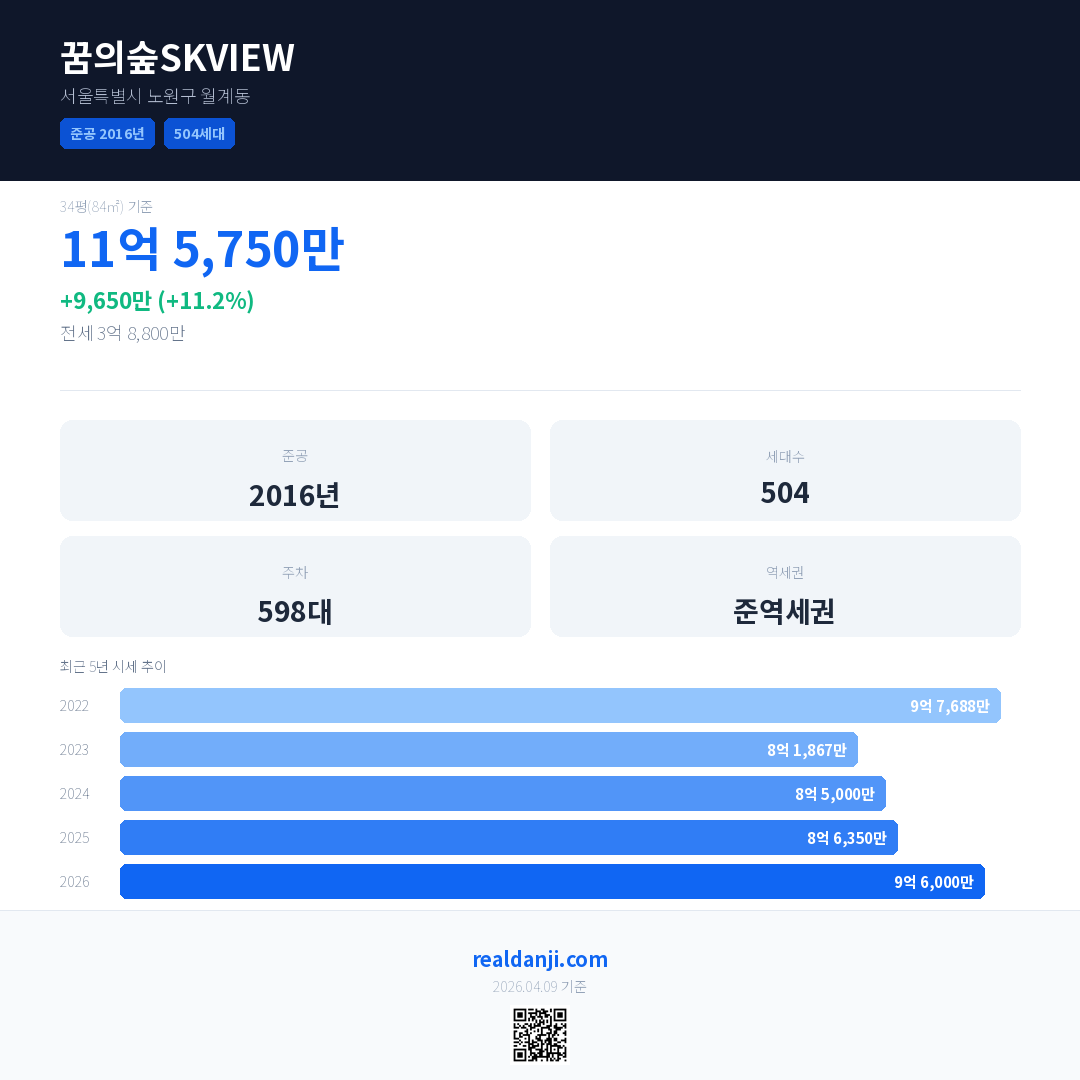 꿈의숲SKVIEW 국민평형 기준 2026년 평균 거래가는 9억 6,000만으로, 전년 대비 11.2% 상승 했습니다.