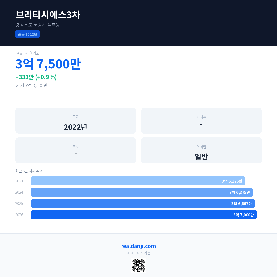 브리티시에스3차 국민평형 기준 2026년 평균 거래가는 3억 7,000만으로, 전년 대비 0.9% 상승 했습니다.