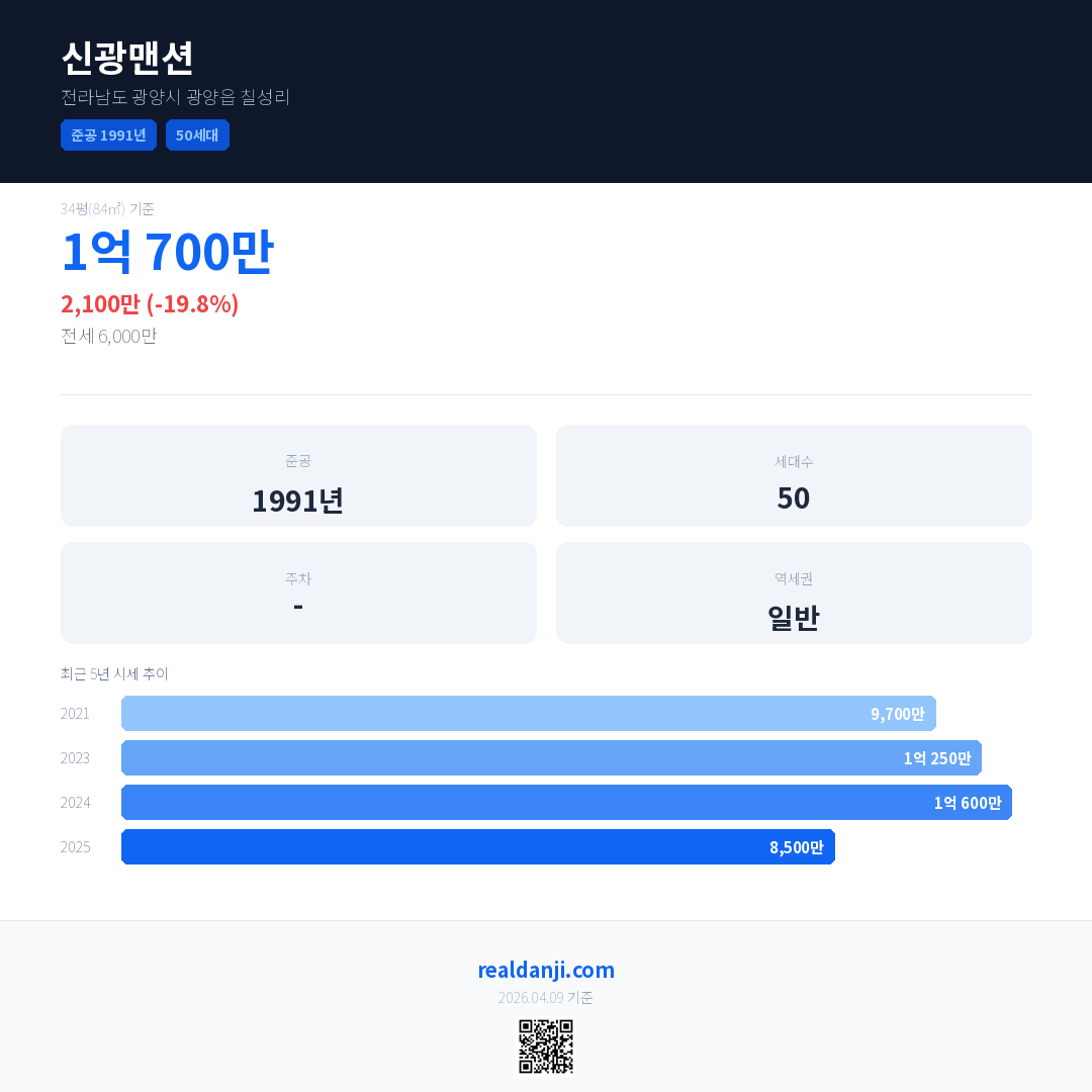 신광맨션 국민평형 기준 2025년 평균 거래가는 8,500만으로, 전년 대비 19.8% 하락 했습니다.