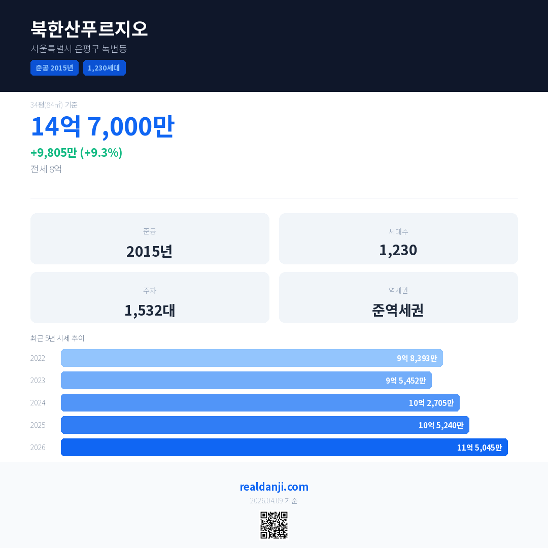 북한산푸르지오 국민평형 기준 2026년 평균 거래가는 11억 5,045만으로, 전년 대비 9.3% 상승 했습니다.