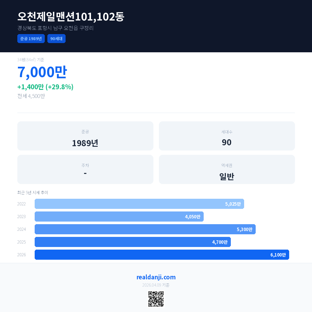 오천제일맨션101,102동 최근 거래가는 7,000만입니다. (2026-01)
