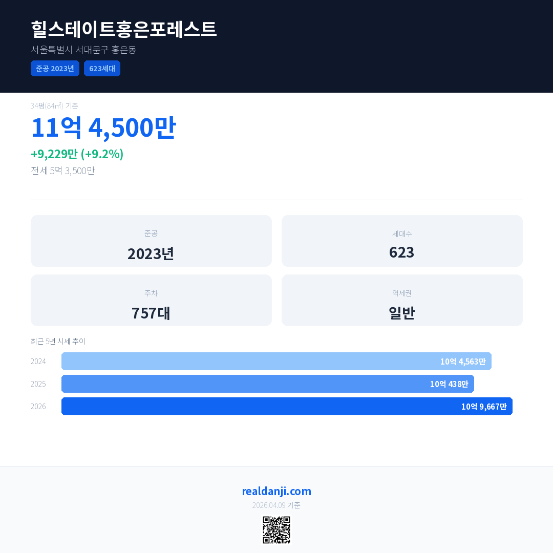 힐스테이트홍은포레스트 국민평형 기준 2026년 평균 거래가는 10억 9,667만으로, 전년 대비 9.2% 상승 했습니다.