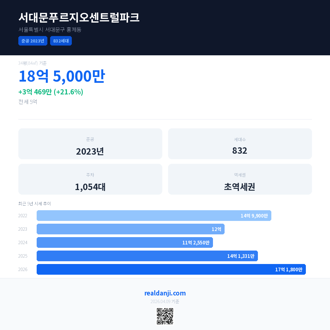 서대문푸르지오센트럴파크은(는) 2023년에 준공되었으며, 현재 3년차입니다. 총 832세대 규모입니다.