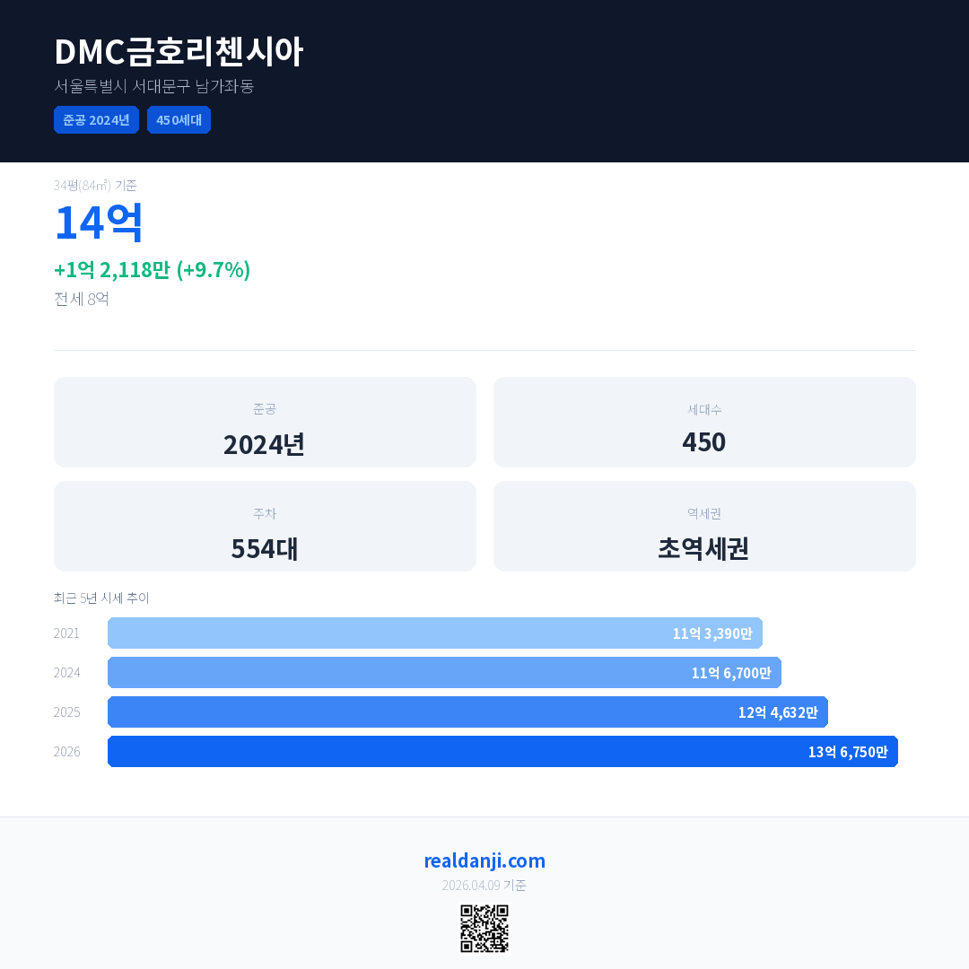 DMC금호리첸시아은(는) 2024년에 준공되었으며, 현재 2년차입니다. 총 450세대 규모입니다.