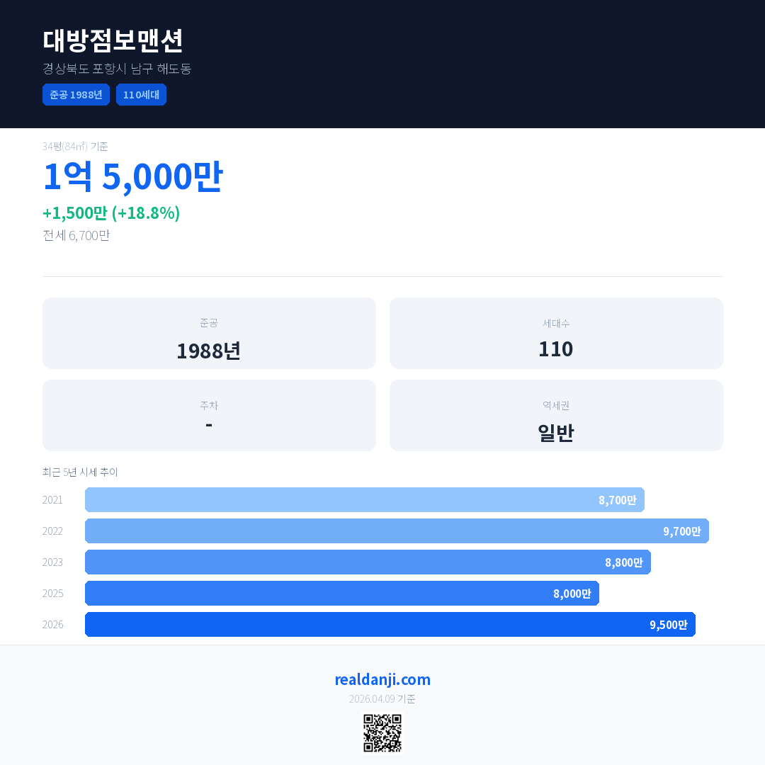 대방점보맨션 국민평형 기준 2026년 평균 거래가는 9,500만으로, 전년 대비 18.8% 상승 했습니다.