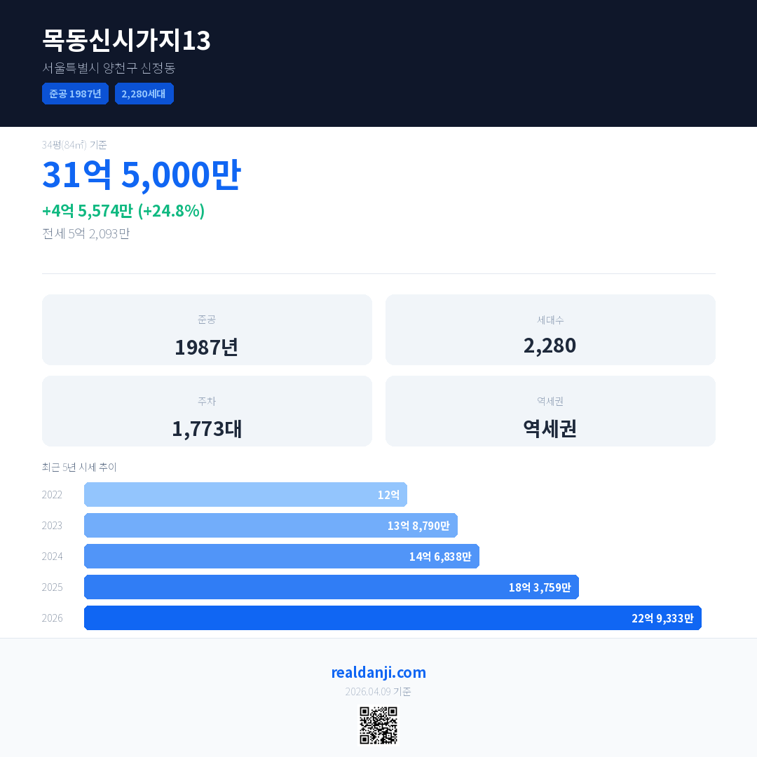 목동신시가지13 국민평형 기준 2026년 평균 거래가는 22억 9,333만으로, 전년 대비 24.8% 상승 했습니다.