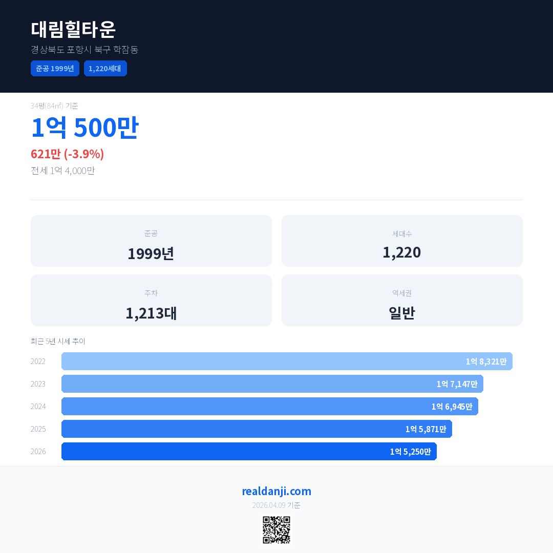 대림힐타운은(는) 1999년에 준공되었으며, 현재 27년차입니다. 총 1,220세대 규모입니다.