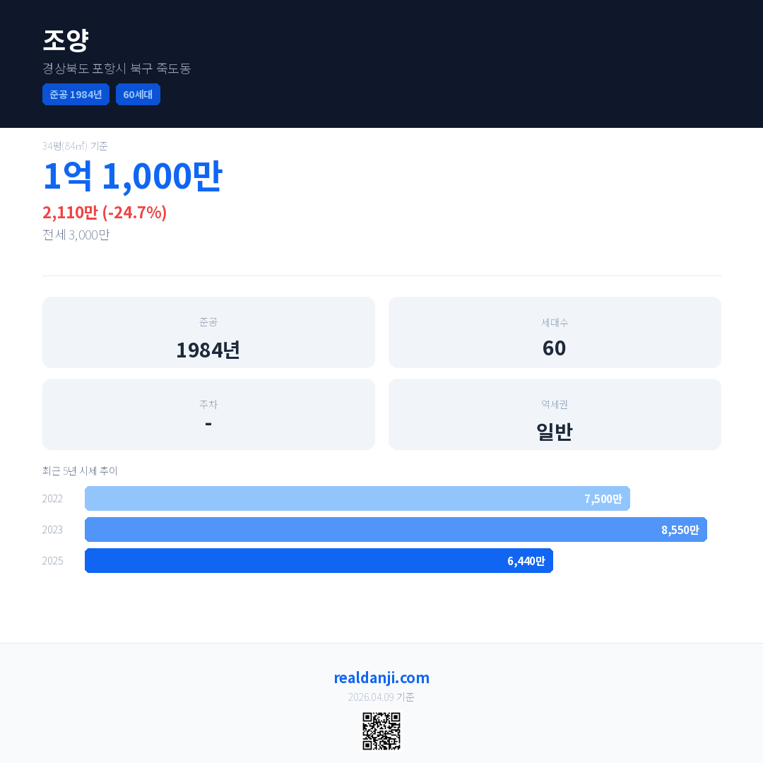 조양 국민평형 기준 2025년 평균 거래가는 6,440만으로, 전년 대비 24.7% 하락 했습니다.