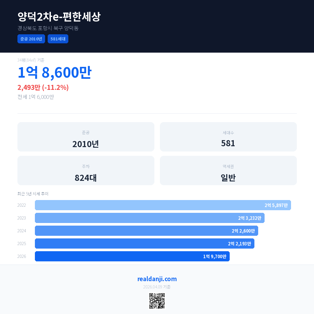 양덕2차e-편한세상 국민평형 기준 2026년 평균 거래가는 1억 9,700만으로, 전년 대비 11.2% 하락 했습니다.