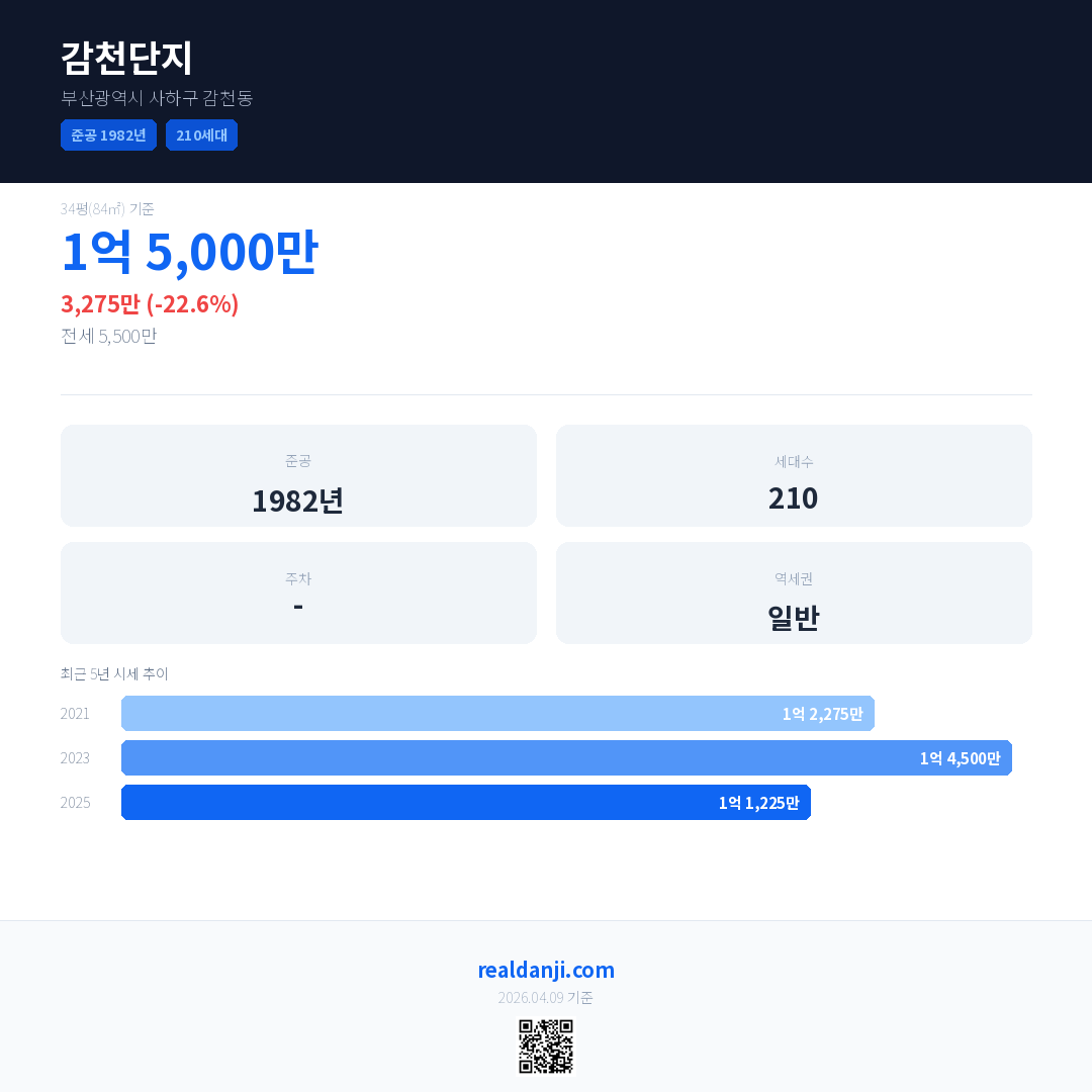 감천단지 국민평형 기준 2025년 평균 거래가는 1억 1,225만으로, 전년 대비 22.6% 하락 했습니다.