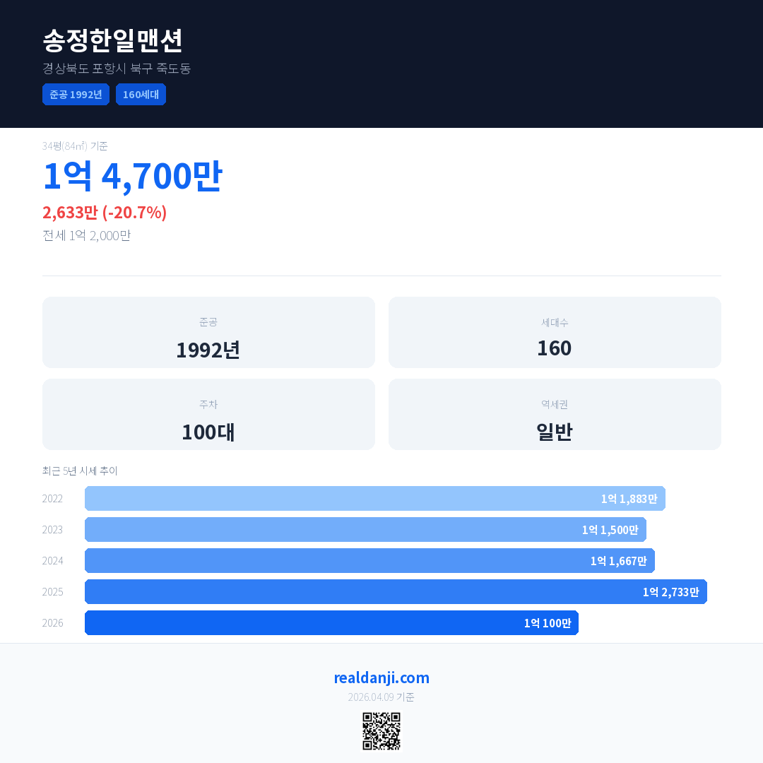 송정한일맨션 최근 거래가는 1억 4,700만입니다. (2026-03)