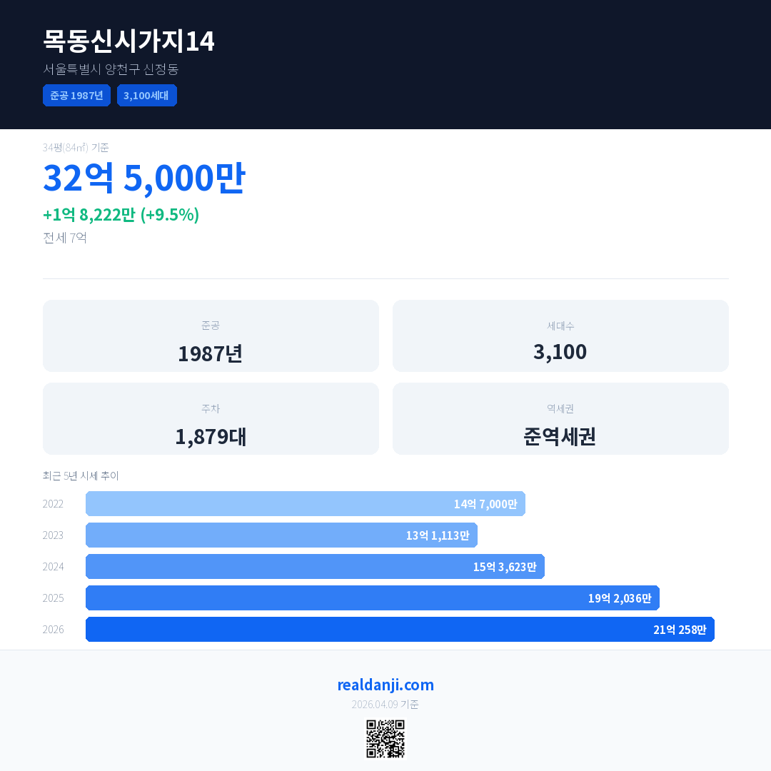 목동신시가지14 국민평형 기준 2026년 평균 거래가는 21억 258만으로, 전년 대비 9.5% 상승 했습니다.