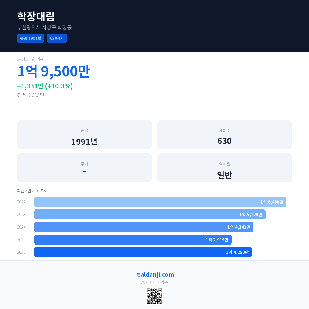 학장대림은(는) 1991년에 준공되었으며, 현재 35년차입니다. 총 630세대 규모입니다.