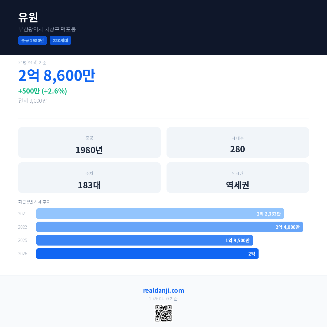유원은(는) 1980년에 준공되었으며, 현재 46년차입니다. 총 280세대 규모입니다.