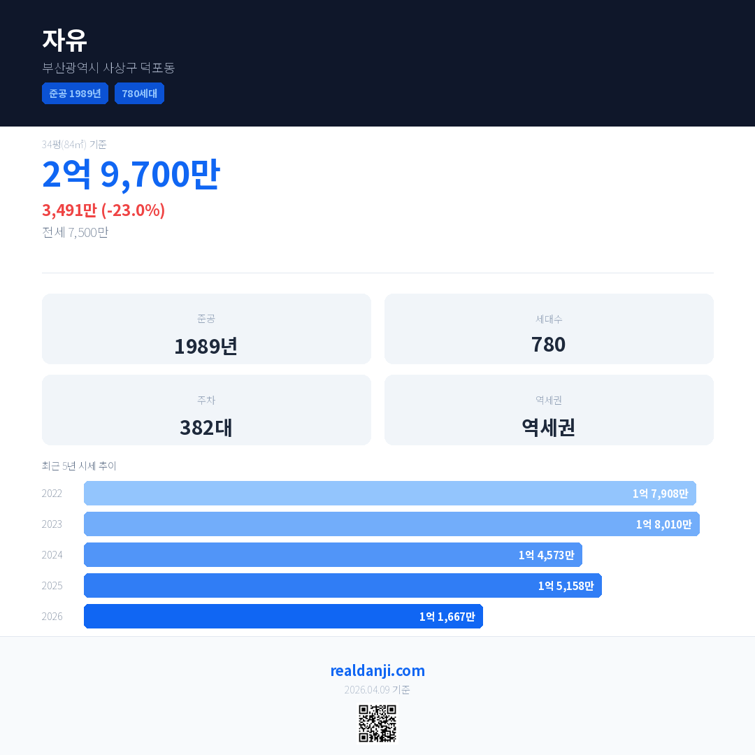 자유은(는) 1989년에 준공되었으며, 현재 37년차입니다. 총 780세대 규모입니다.