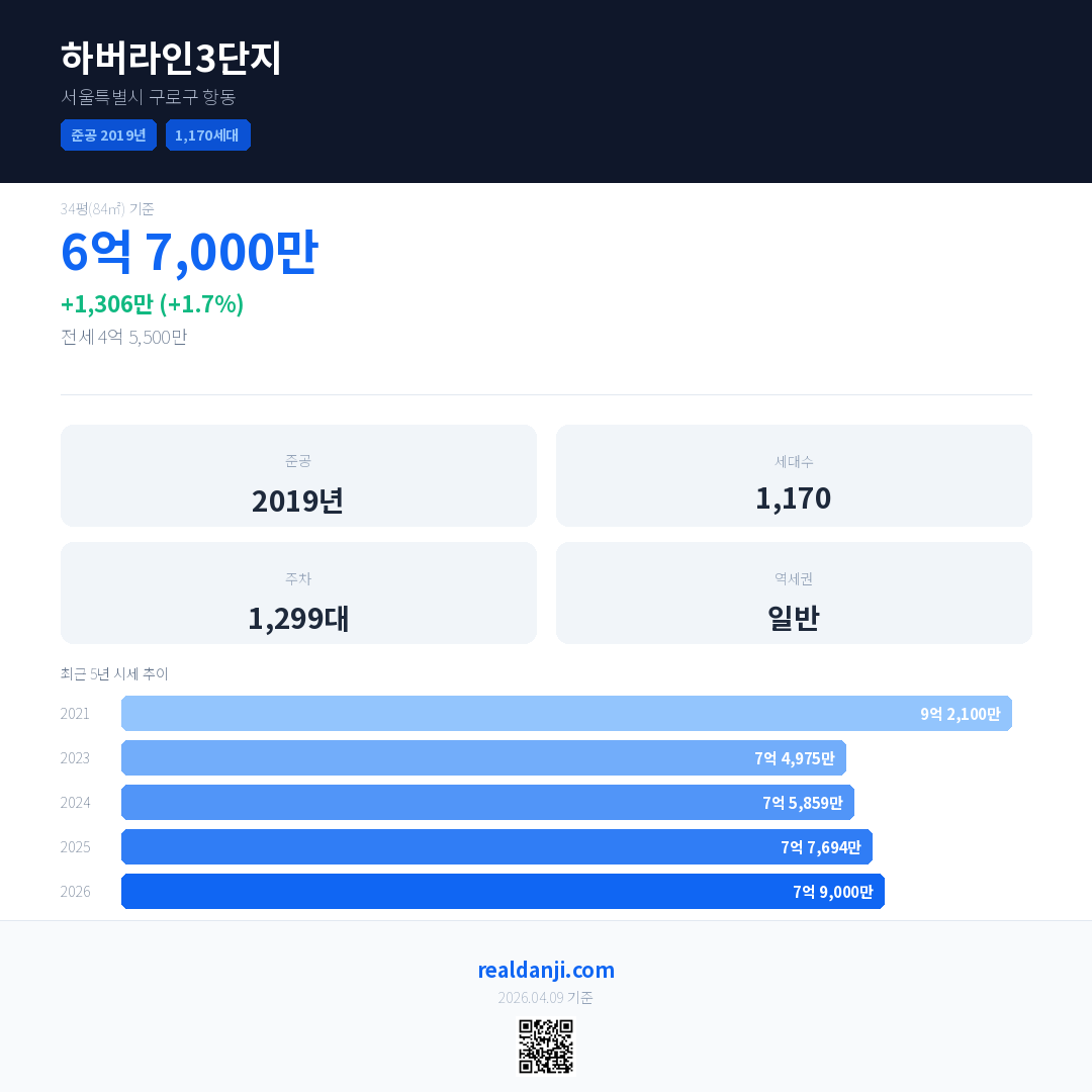하버라인3단지 국민평형 기준 2026년 평균 거래가는 7억 9,000만으로, 전년 대비 1.7% 상승 했습니다.