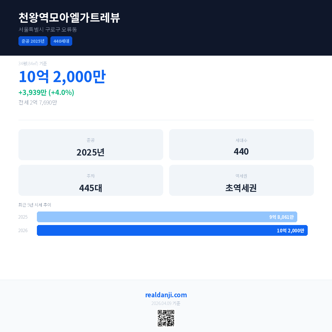 천왕역모아엘가트레뷰 국민평형 기준 2026년 평균 거래가는 10억 2,000만으로, 전년 대비 4.0% 상승 했습니다.