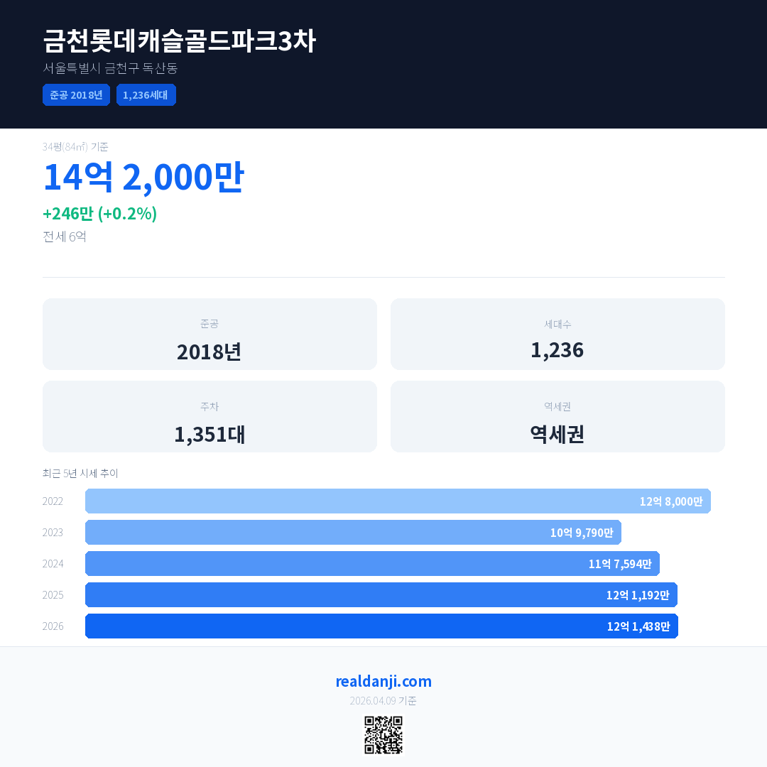금천롯데캐슬골드파크3차 최근 거래가는 14억 2,000만입니다. (2026-03)