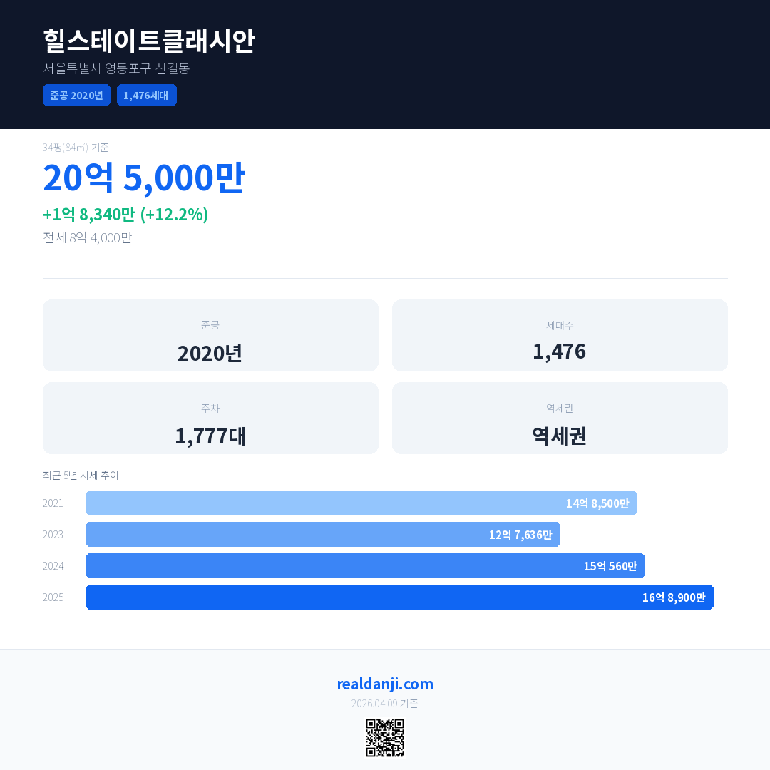 힐스테이트클래시안 최근 거래가는 20억 5,000만입니다. (2026-04)