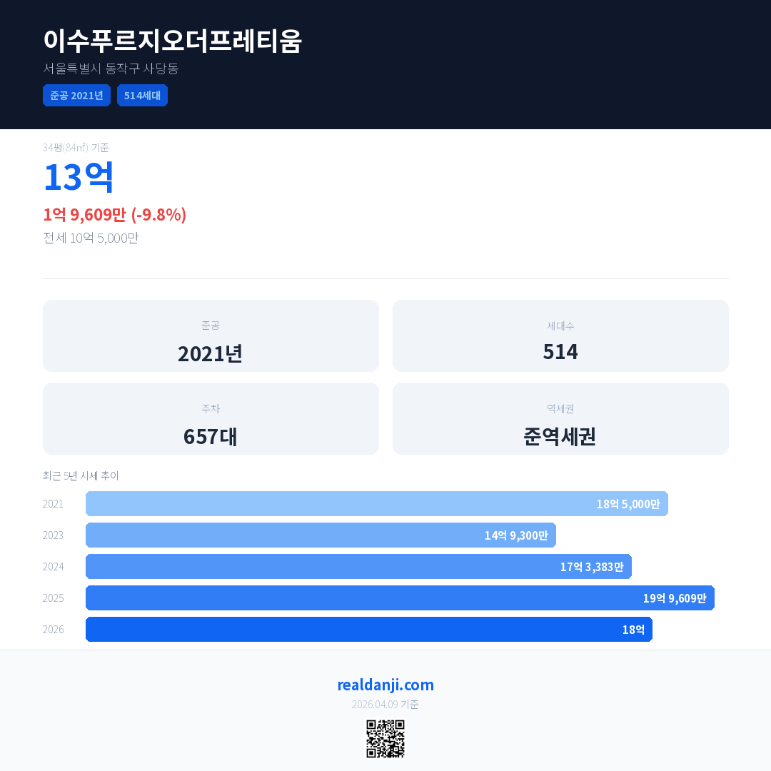 이수푸르지오더프레티움 최근 거래가는 13억입니다. (2026-03)