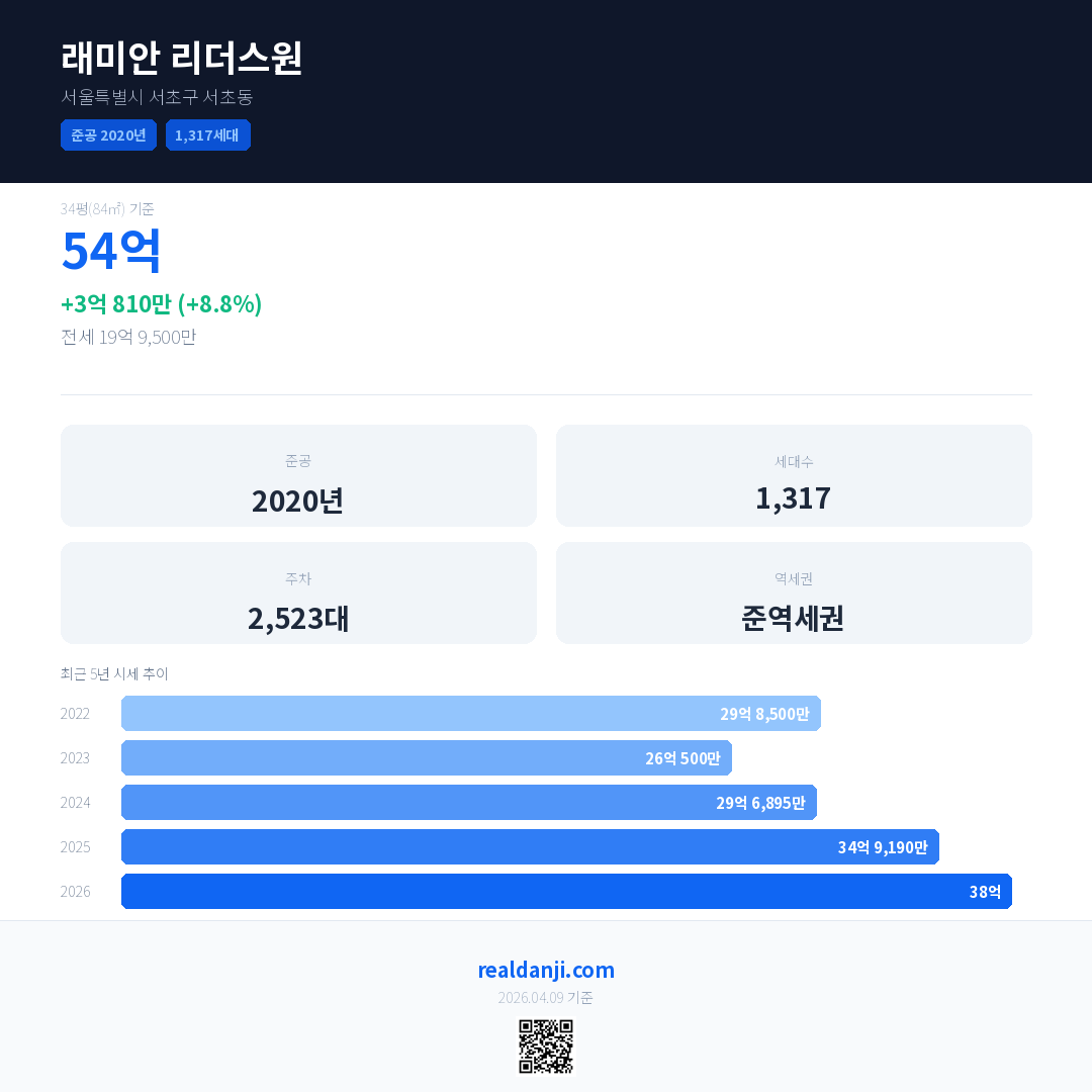 래미안 리더스원은(는) 2020년에 준공되었으며, 현재 6년차입니다. 총 1,317세대 규모입니다.