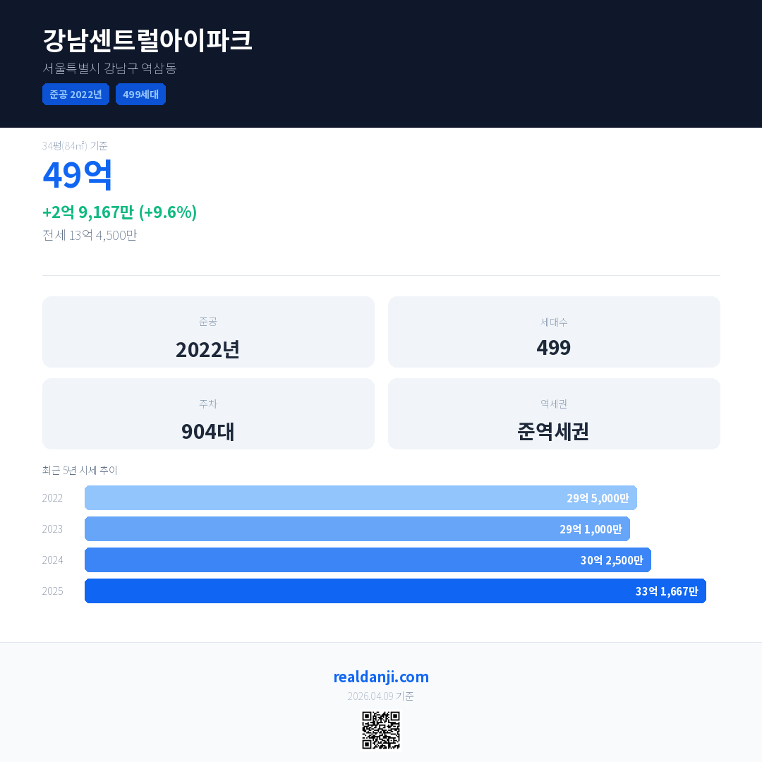 강남센트럴아이파크은(는) 2022년에 준공되었으며, 현재 4년차입니다. 총 499세대 규모입니다.