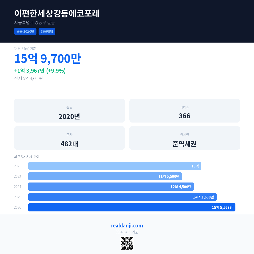 이편한세상강동에코포레 국민평형 기준 2026년 평균 거래가는 15억 5,567만으로, 전년 대비 9.9% 상승 했습니다.