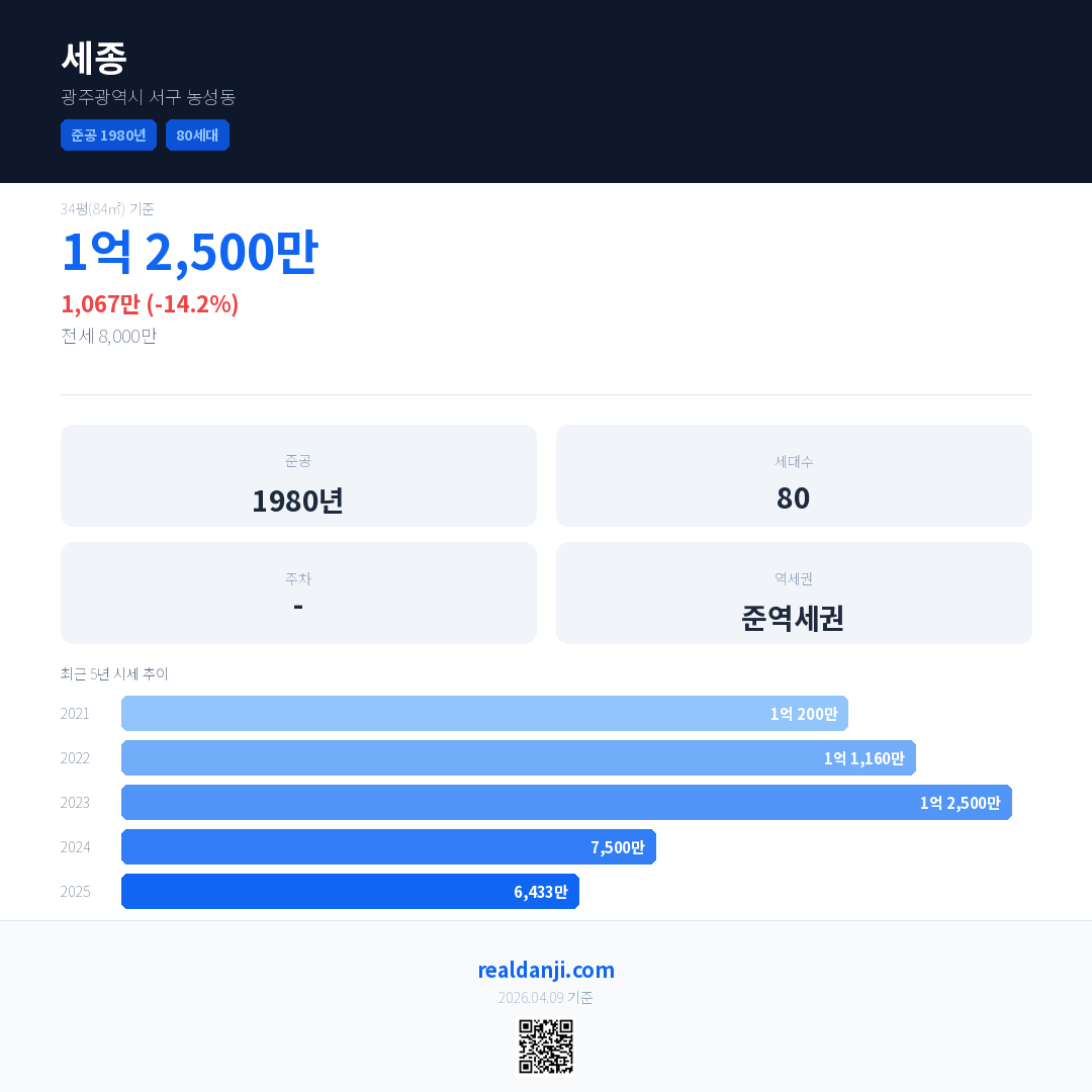 세종은(는) 1980년에 준공되었으며, 현재 46년차입니다. 총 80세대 규모입니다.