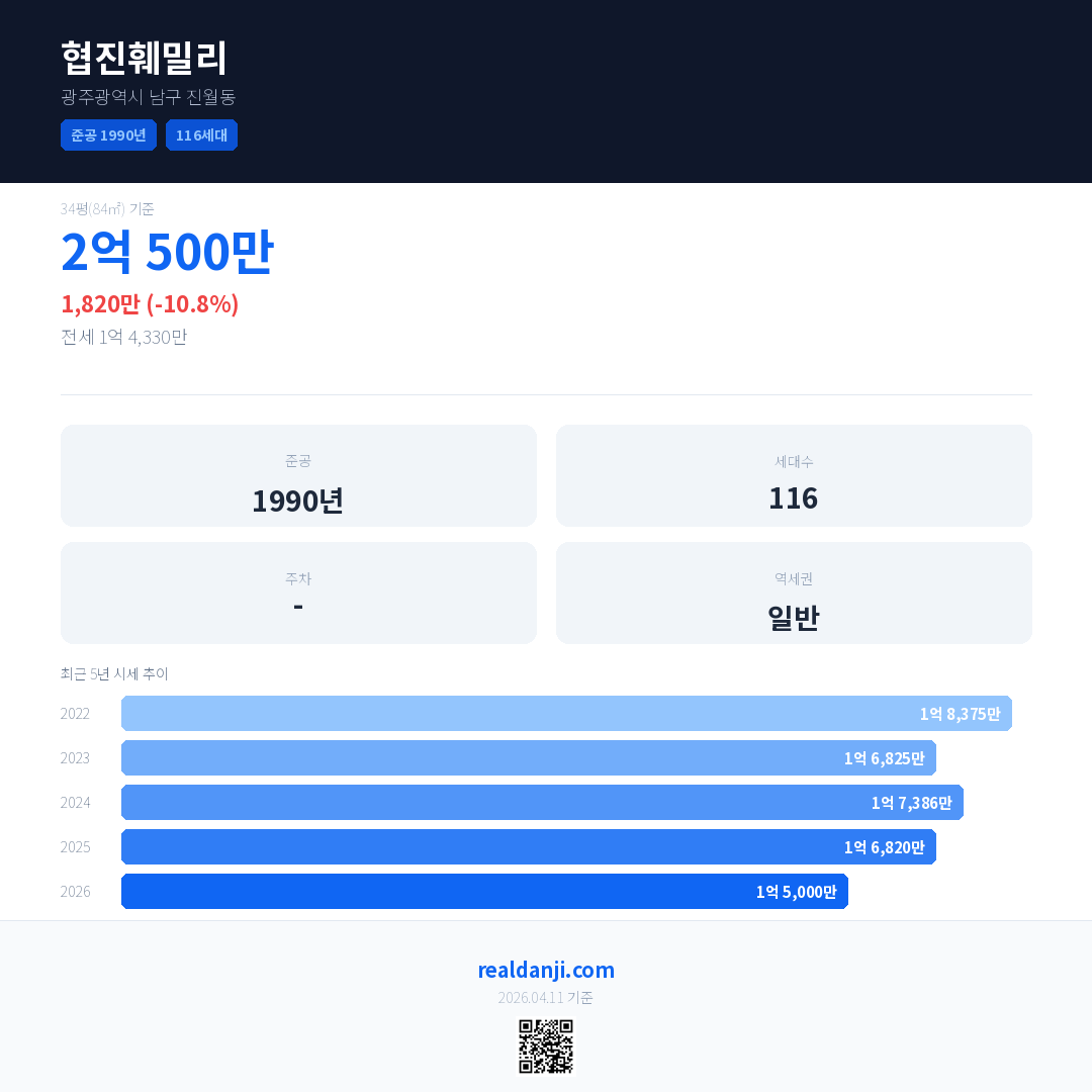 협진훼밀리 국민평형 기준 2026년 평균 거래가는 1억 5,000만으로, 전년 대비 10.8% 하락 했습니다.