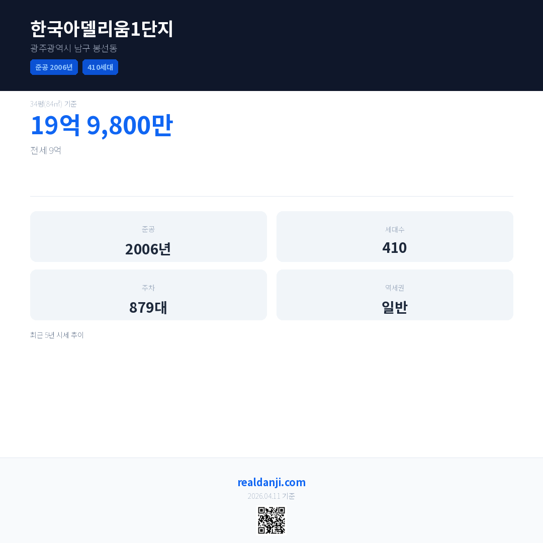 한국아델리움1단지은(는) 2006년에 준공되었으며, 현재 20년차입니다. 총 410세대 규모입니다.