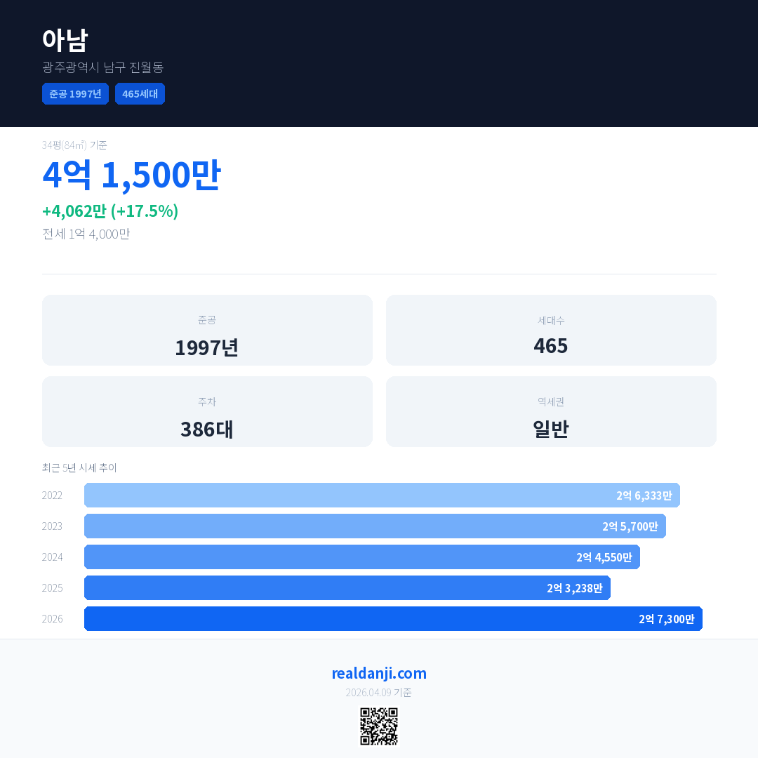 아남 국민평형 기준 2026년 평균 거래가는 2억 7,300만으로, 전년 대비 17.5% 상승 했습니다.