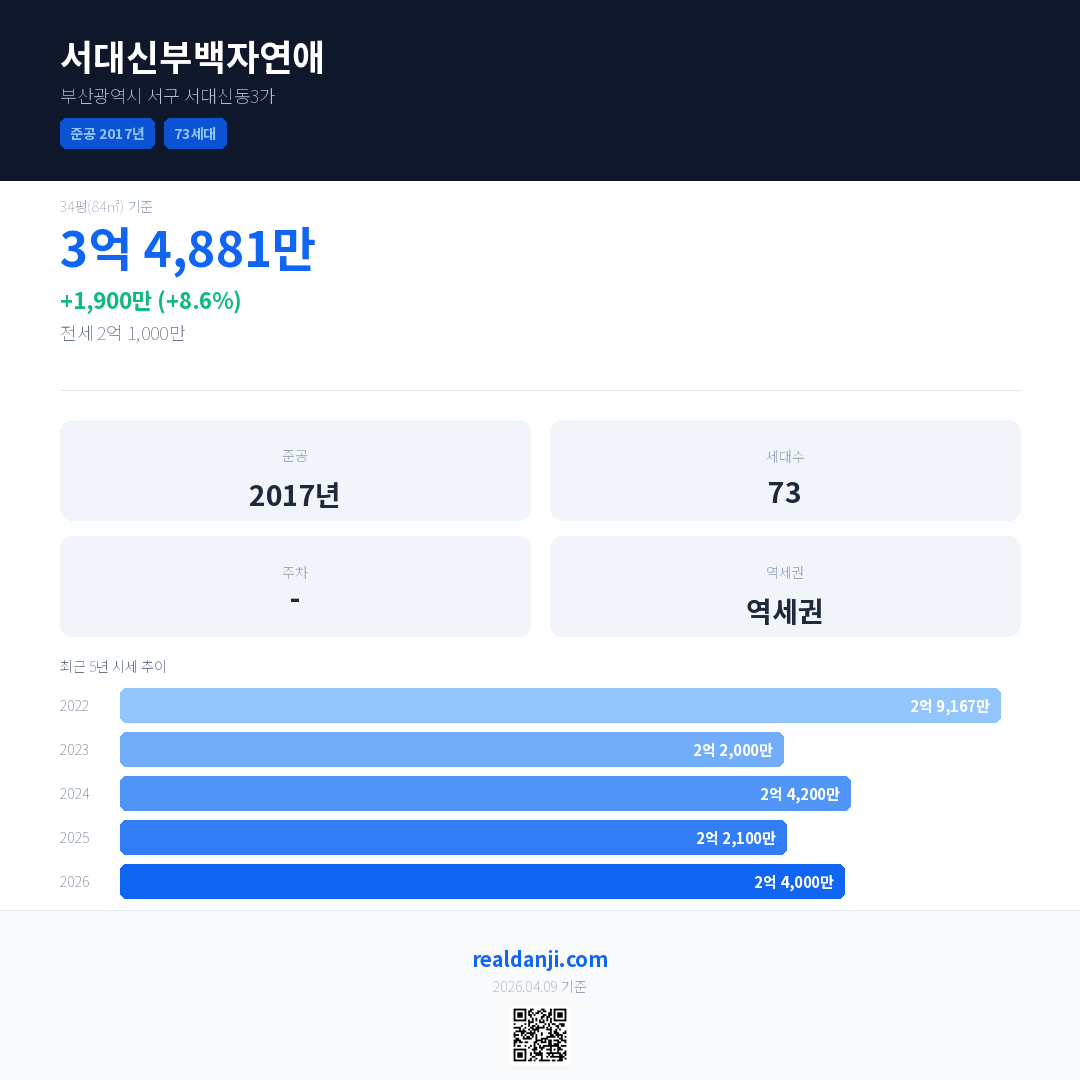서대신부백자연애 국민평형 기준 2026년 평균 거래가는 2억 4,000만으로, 전년 대비 8.6% 상승 했습니다.