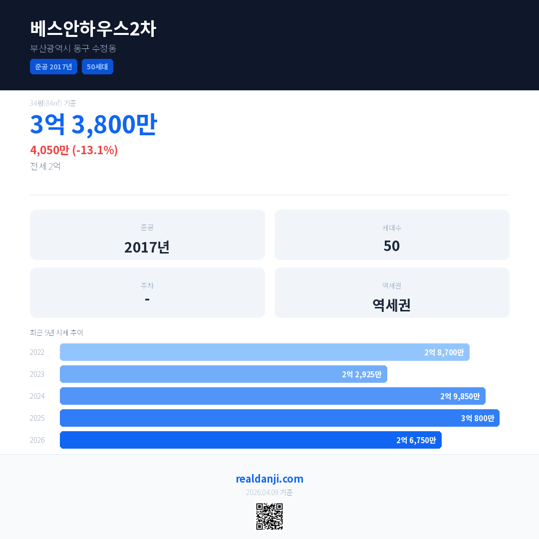 베스안하우스2차은(는) 2017년에 준공되었으며, 현재 9년차입니다. 총 50세대 규모입니다.