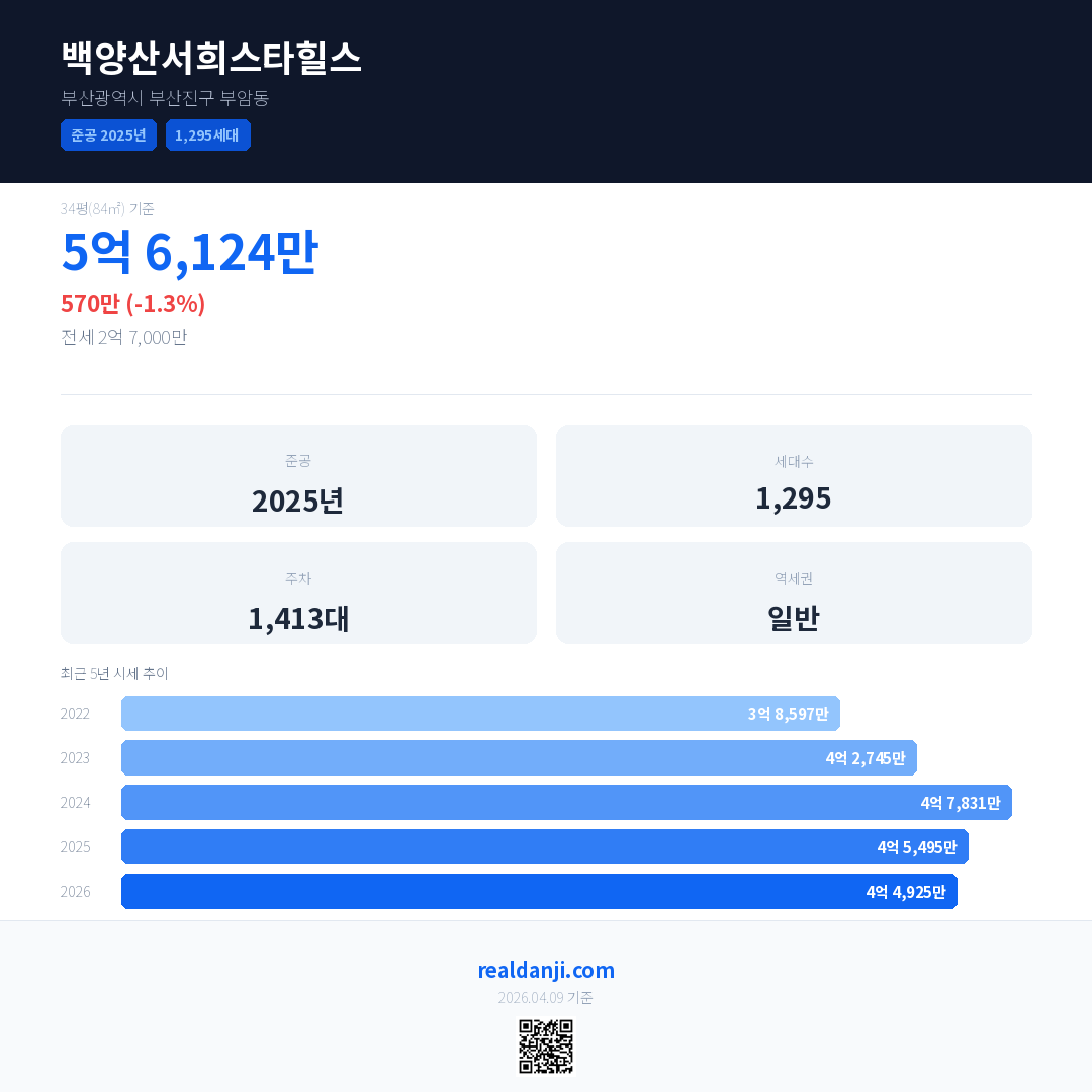 백양산서희스타힐스 최근 거래가는 5억 6,124만입니다. (2026-03)