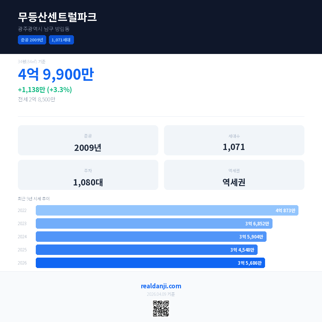 무등산센트럴파크 최근 거래가는 4억 9,900만입니다. (2026-02)