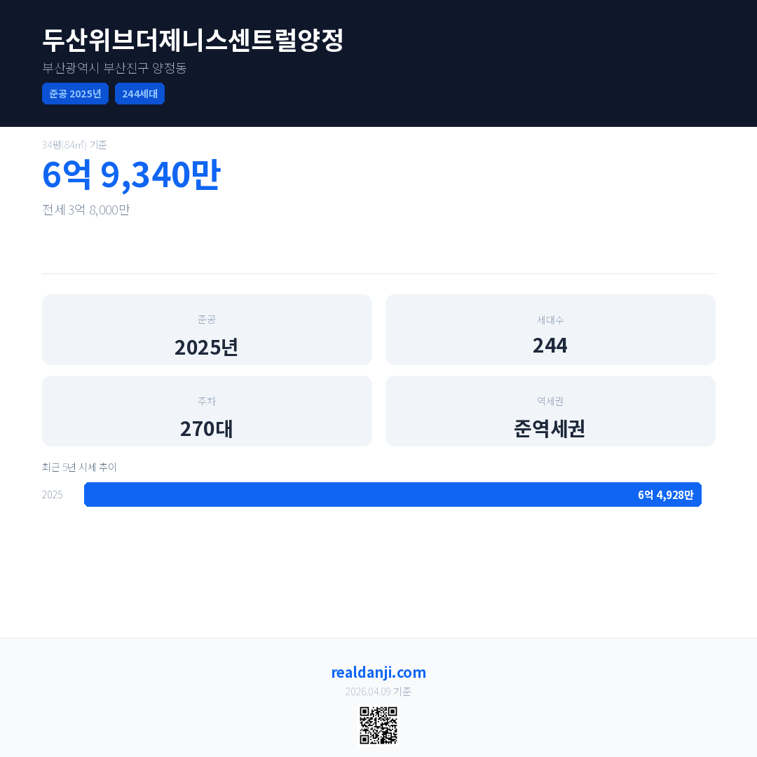 두산위브더제니스센트럴양정 최근 거래가는 6억 9,340만입니다. (2025-12)