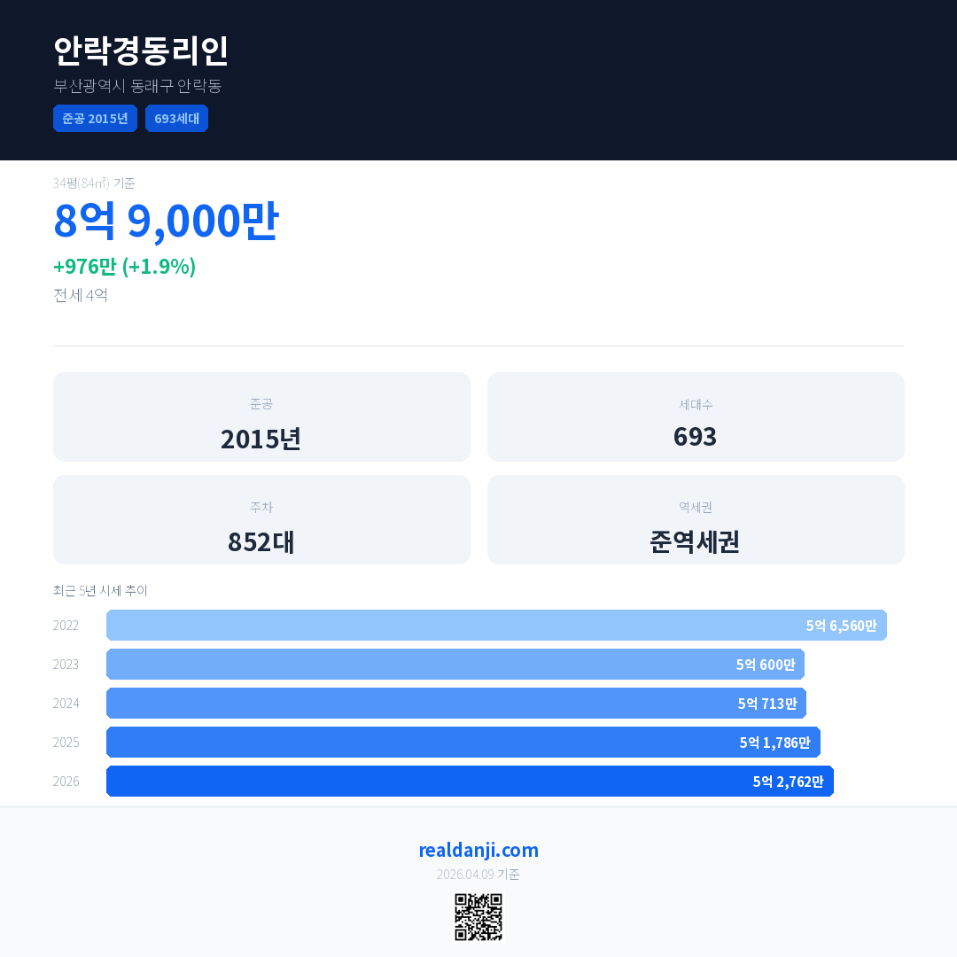 안락경동리인 국민평형 기준 2026년 평균 거래가는 5억 2,762만으로, 전년 대비 1.9% 상승 했습니다.