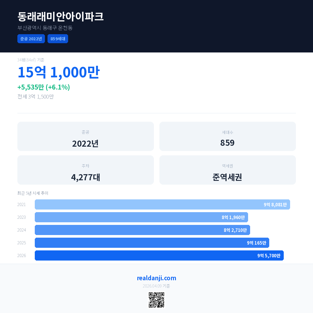 동래래미안아이파크 최근 거래가는 15억 1,000만입니다. (2026-04)