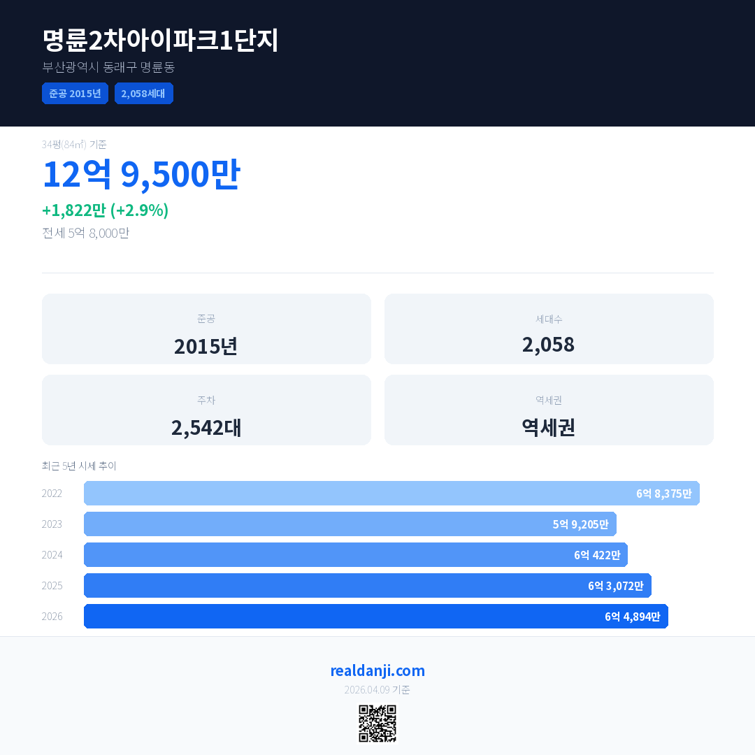 명륜2차아이파크1단지 국민평형 기준 2026년 평균 거래가는 6억 4,894만으로, 전년 대비 2.9% 상승 했습니다.