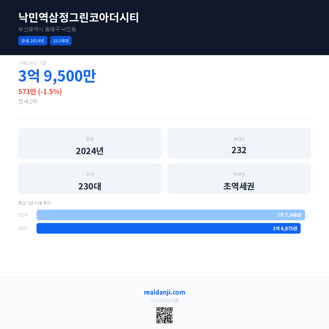 낙민역삼정그린코아더시티 국민평형 기준 2025년 평균 거래가는 3억 6,875만으로, 전년 대비 1.5% 하락 했습니다.