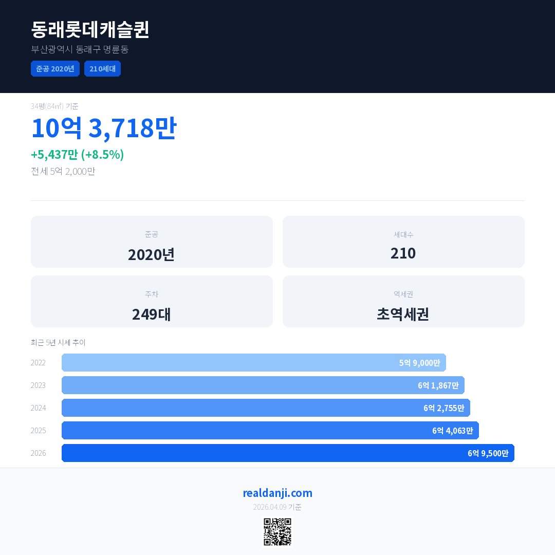 동래롯데캐슬퀸 최근 거래가는 10억 3,718만입니다. (2026-01)