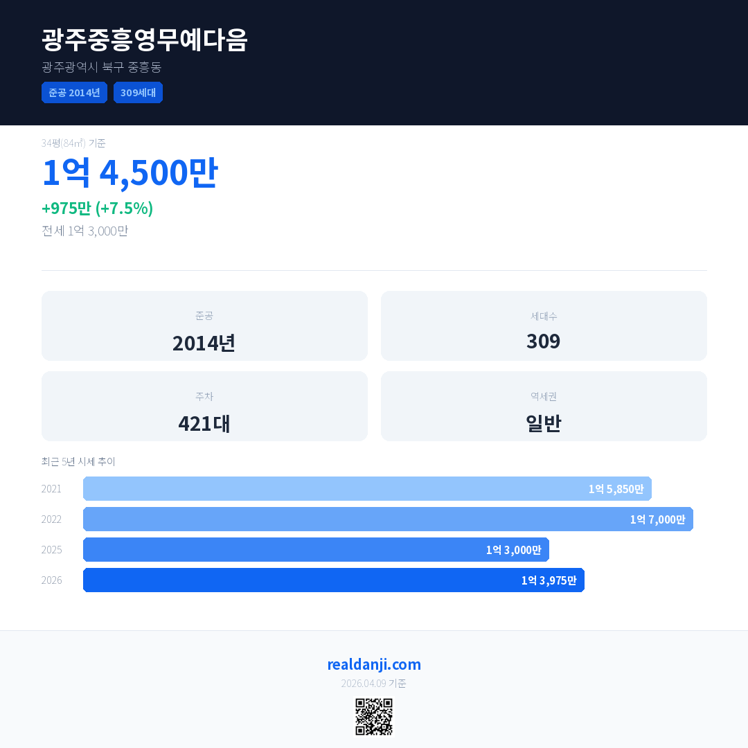 광주중흥영무예다음 국민평형 기준 2026년 평균 거래가는 1억 3,975만으로, 전년 대비 7.5% 상승 했습니다.