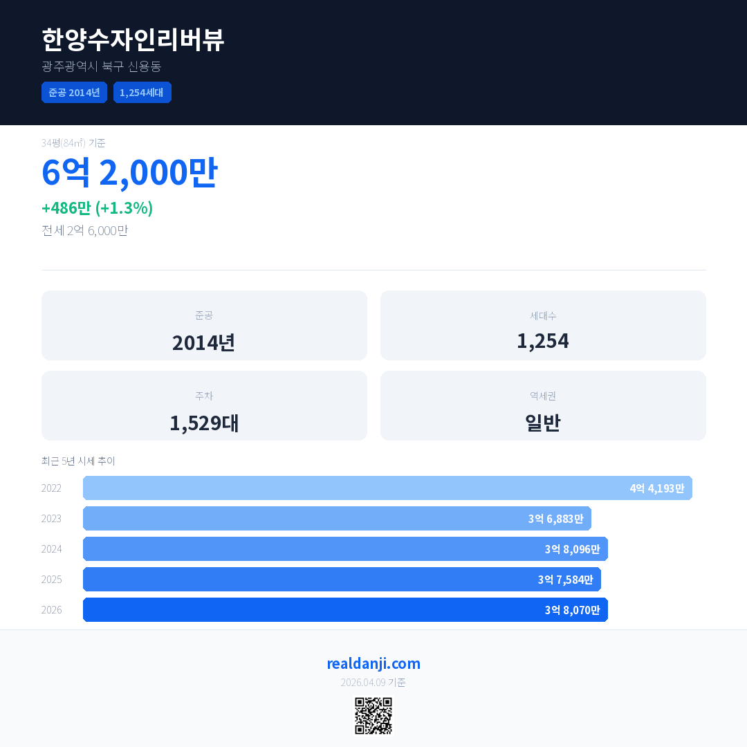 한양수자인리버뷰 국민평형 기준 2026년 평균 거래가는 3억 8,070만으로, 전년 대비 1.3% 상승 했습니다.