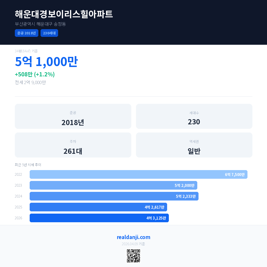 해운대경보이리스힐아파트 국민평형 기준 2026년 평균 거래가는 4억 3,125만으로, 전년 대비 1.2% 상승 했습니다.