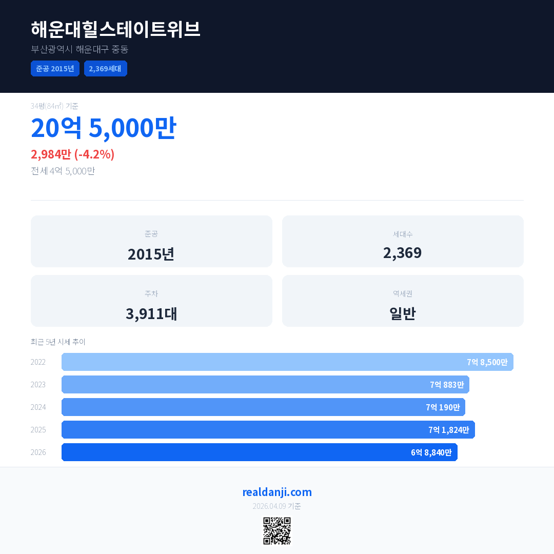 해운대힐스테이트위브 최근 거래가는 20억 5,000만입니다. (2026-03)