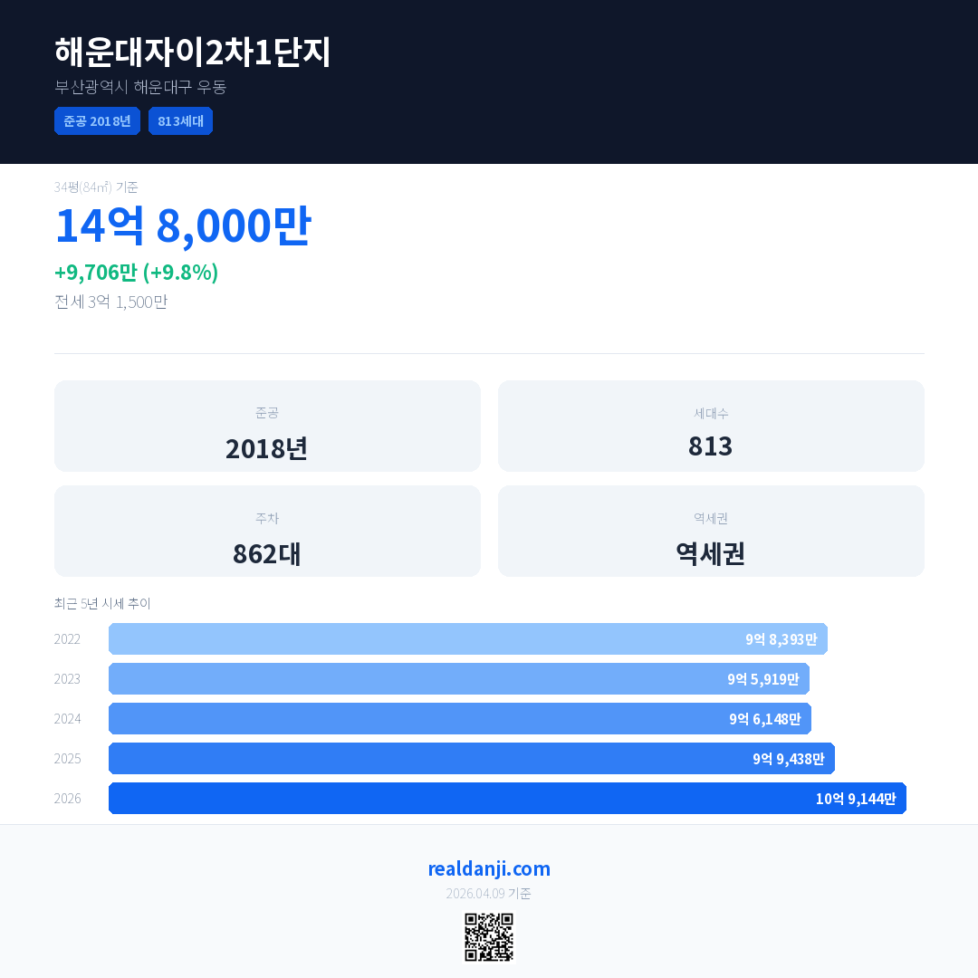 해운대자이2차1단지 국민평형 기준 2026년 평균 거래가는 10억 9,144만으로, 전년 대비 9.8% 상승 했습니다.