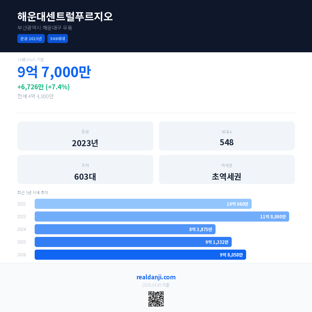 해운대센트럴푸르지오은(는) 2023년에 준공되었으며, 현재 3년차입니다. 총 548세대 규모입니다.