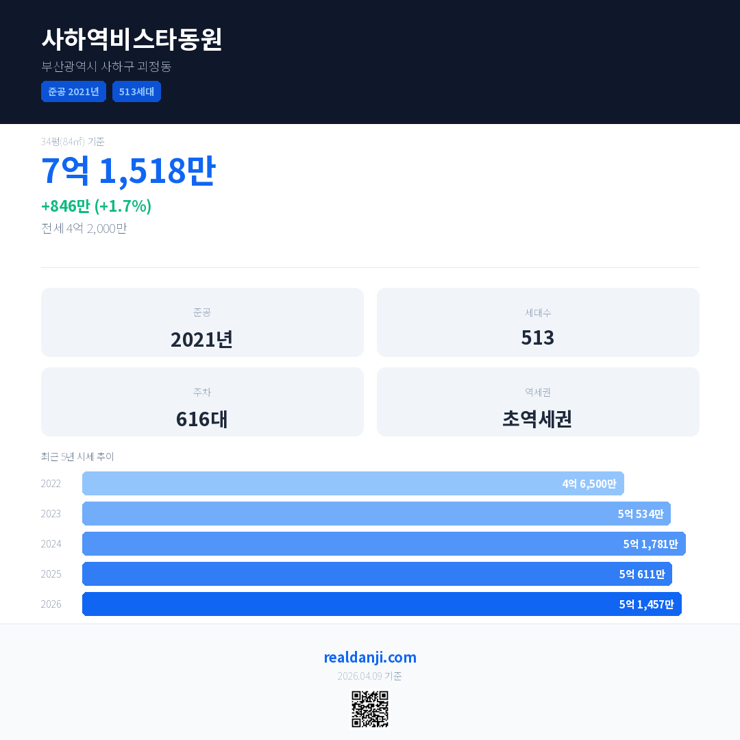 사하역비스타동원 국민평형 기준 2026년 평균 거래가는 5억 1,457만으로, 전년 대비 1.7% 상승 했습니다.